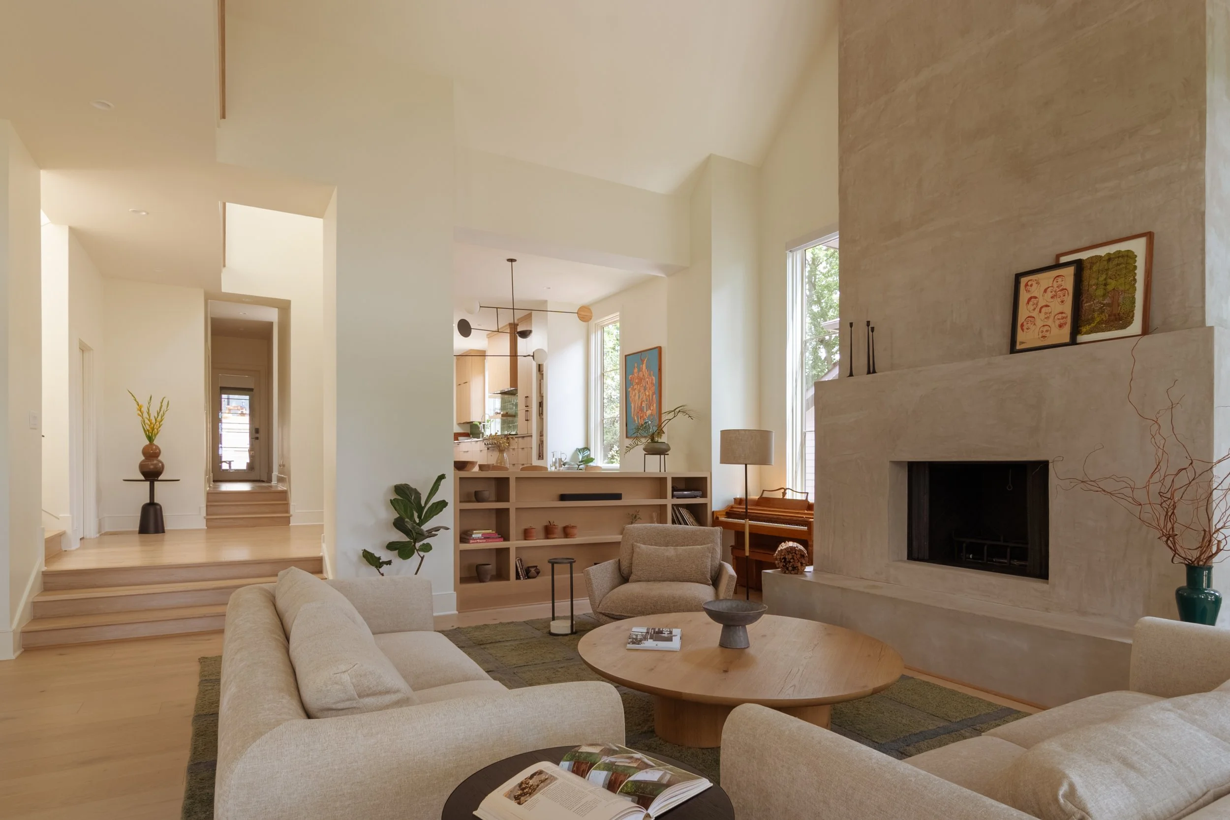 Material selections and interior details balance durability with character, reflecting the needs of a growing family alongside a refined aesthetic. Engineered flooring made from reclaimed wood brings warmth and resilience, while custom tile, expressive wallpaper, and vibrant fixtures introduce moments of color and personality against a neutral backdrop. The plaster exterior reinterprets traditional techniques with modern detailing, aligning with the clients’ appreciation for a more contemporary, even subtly brutalist sensibility, while still respecting the surrounding historic fabric.