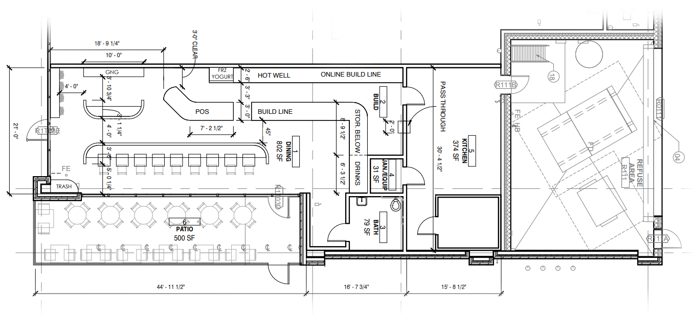 Radish Kitchen is a fast-casual dining restaurant founded by Amanda Frederickson. This tenant build-out is located in Aspen Grove in Franklin, TN. We worked with the existing building space from the 1950s and found creative solutions to acknowledge the raw elements and materials of the space. Using the column grid as a guide, we created a sense of flow throughout the space to guide customers. Inspired by the owner's West Coast and Southern Florida background, we melded interior design elements that paid homage to her roots. A prime example is the breeze blocks, typical of Southern Florida, which here compose a half-height wall separating dining space from circulation. Details such as light wood millwork, abstract colorful murals, and the integration of branding colors round up the design, resulting in an area that feels as fresh and light as the food Radish Kitchen serves.